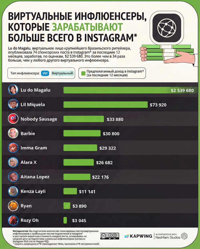 Цифры взял из иследования Kapwing по самым высокооплачиваемым ИИ-инфлюренсам.