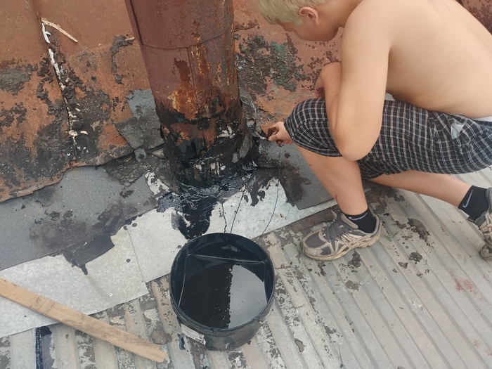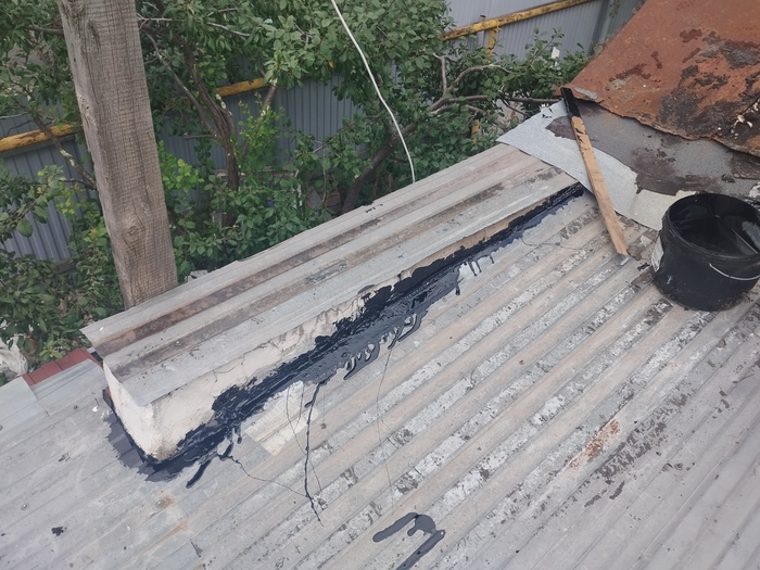 Стали искать дырку по середине этого плоского участка кровли, вроде дырок и щелей нет, мазюкнули один подозрительный участок и решили пока закончить и посмотреть результат работ во время дождя.