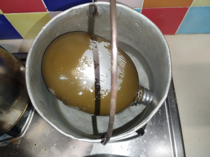 В кастрюлю налил воду в кастрюлю поместил фляжку и всё вместе поставил на плиту.