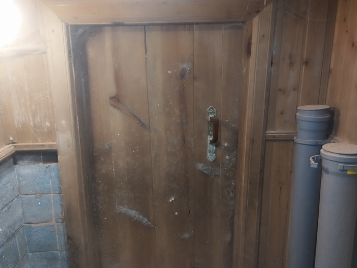 Внутренняя поверхность входной двери покрыта наледью, значит в курятнике теплее чем на улице, через дверь пробирается мороз и сталкивается с теплом.