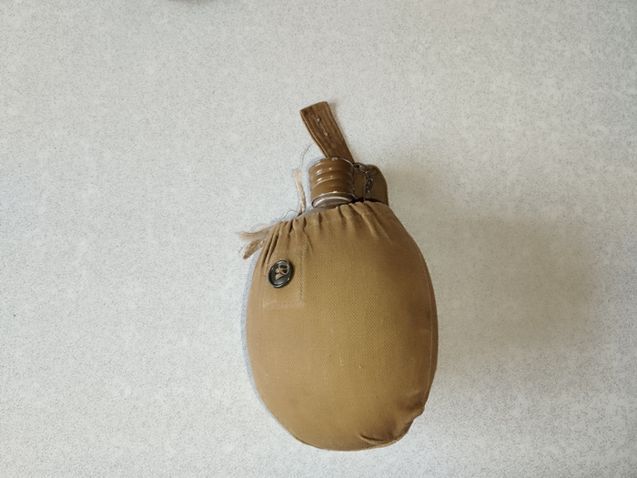 Первой мыслью было пришить к брезентовому чехлу ремешок для переноски фляжки на плече, но подумал, что ремешок будет мешаться и путаться во время использования фляжки, тем более, что давно фляжку не беру и если возьму лежать она будет в рюкзаке.