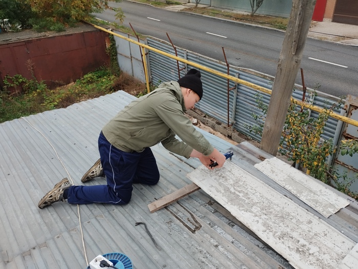 Нелегко подгонять к старому гнутому снегом козырьку, старый гнутый жизнью и цементным раствором кусок кровельного железа. Всё играет, всё кривое без сына который поджимал рычагом и подстукивал молотком я бы не справился.