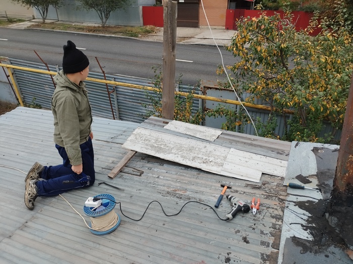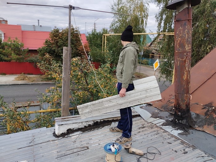 Нашёл кусок кровельного железа и мы с сыном примеряем его на крыше.