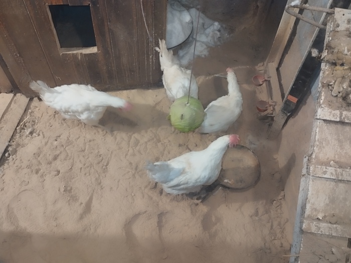Кроме комбикорма и сала для курочек есть витаминная подкормка, подвешен качан капусты.