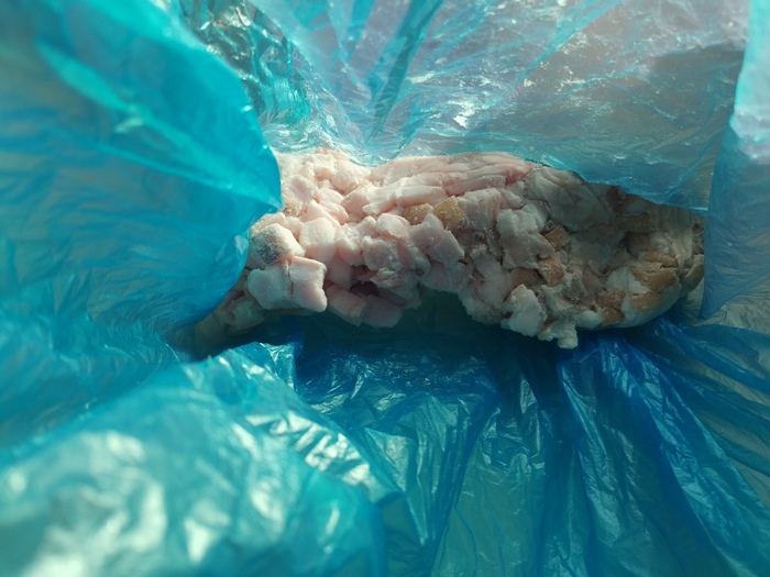 На фото мешок с нарезанным для кур салом.