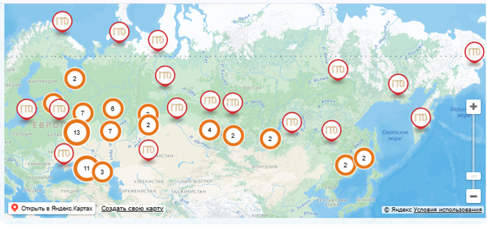 На картинке ниже на карте обозначены центры принятия нормативов ГТО