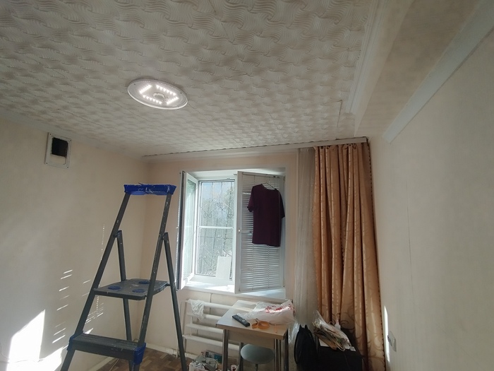 Места в комнате стало больше, тёмный шкаф убрали, новый светильник поставили и света стало больше, вынесли проссанный диван чистого воздуха стало больше, настроение у хозяйки явно улучшилось.