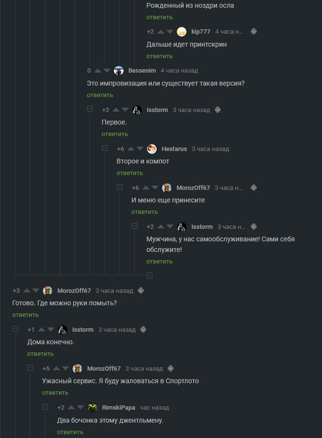 Включаем повторно воду - кран опять срывает, директор только и высказал, уже без крика: "Да такую вашу мать..." - и запихнул в трубу уже другую руку. Тут уж выключать воду стали не сразу, вначале отсмеялись. К чести директора, тот уже не орал, стоически терпел.