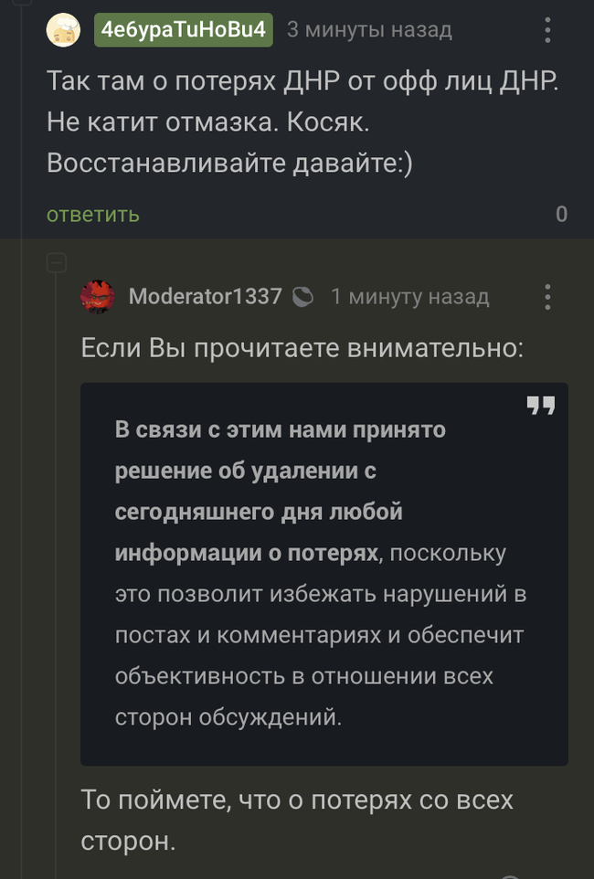 Что показательно, все, кто постит в вечернее время, общаются весьма корректно и на оскорбления/провокации не ведутся. Так же присутствует ещё один Интересный момент, если им ответить не в их духе, то под комментом, в течении 10-30 секунд появляется от 5 до 15 минусов. Их же комментарии, часто несущие откровенно русофобский характер, сразу уходят в плюс(+ 10-30). Ещё один Интересный момент, они игнорят спецтеги «Украина» и «политика». Ну и вишенка, игнорируют адекватные вопросы к ним(просто не отвечают, если вопрос вопрос идёт в разрез с их линией суждений), загоняя за секунды этот вопрос в минус.