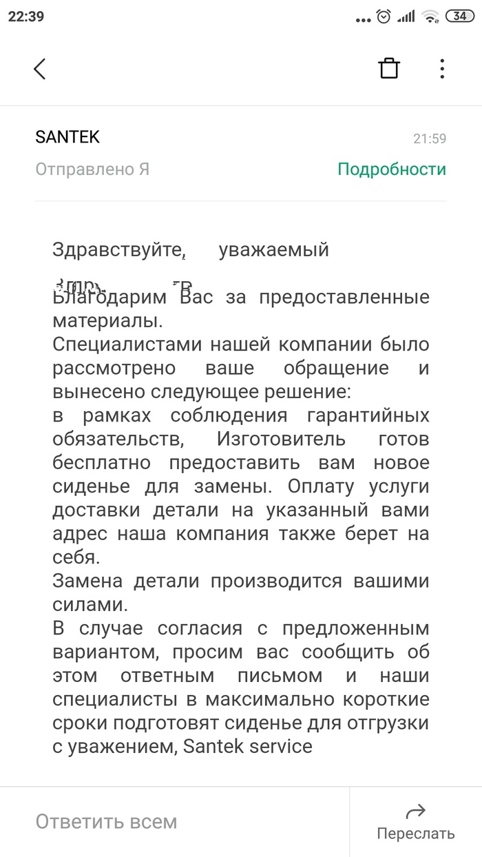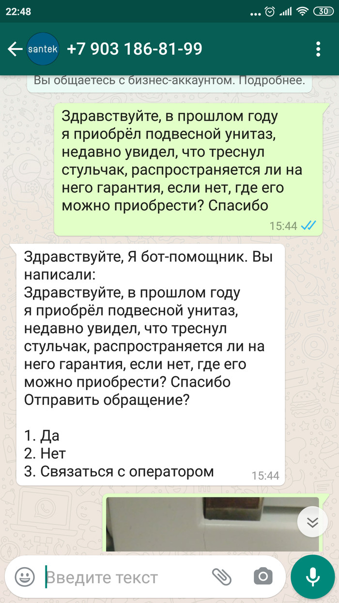 Вдохновившись постом Сантехника Roca. Сервис на высоте! я решил написать компании santek. Чуть больше года назад купил унитаз, месяц назад увидел трещину на стульчаке. Цены, конечно, на сидения для унитаза с микролифтом меня огорчили. И вот я прочитал вышеназванный пост. Нашел на сайте ссылку на ватсап, отправил обращение, мне ответили, чтобы отправил данные, зарегистрировали обращение. Сегодня, то есть на третий день мне пришло на электронную почту сообщение, о том, что мне отправят бесплатно по гарантии. Если честно, не верил, но надеялся.
