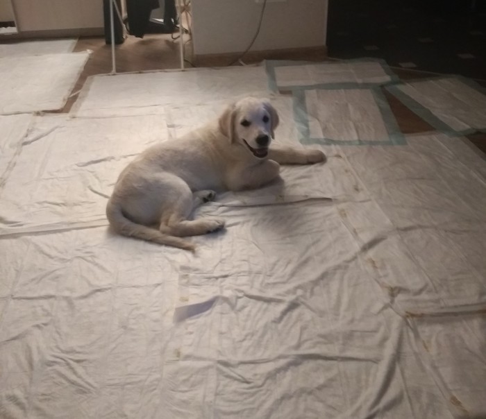Забрали его специально перед выходными, чтобы за пару дней пес попривык к новому месту и отошел от разлуки. В общем-то в воскресенье он уже чувствовал себя как дома (видать радовался что съехал наконец от вредных рдственников). В первые дни весь ламинат был застелен пеленками (спасибо большое заводчикам, что пес был к ним приучен), а потом за пару дней их количество сократилось до 1-2 в комнате, но наступали будни...