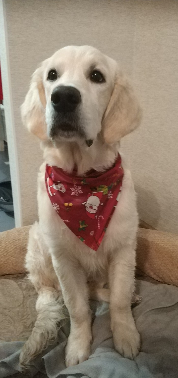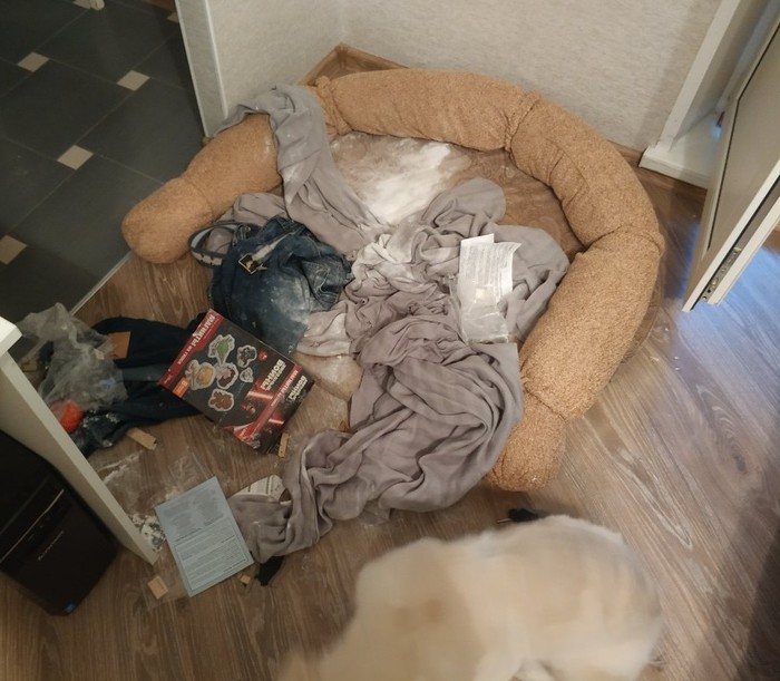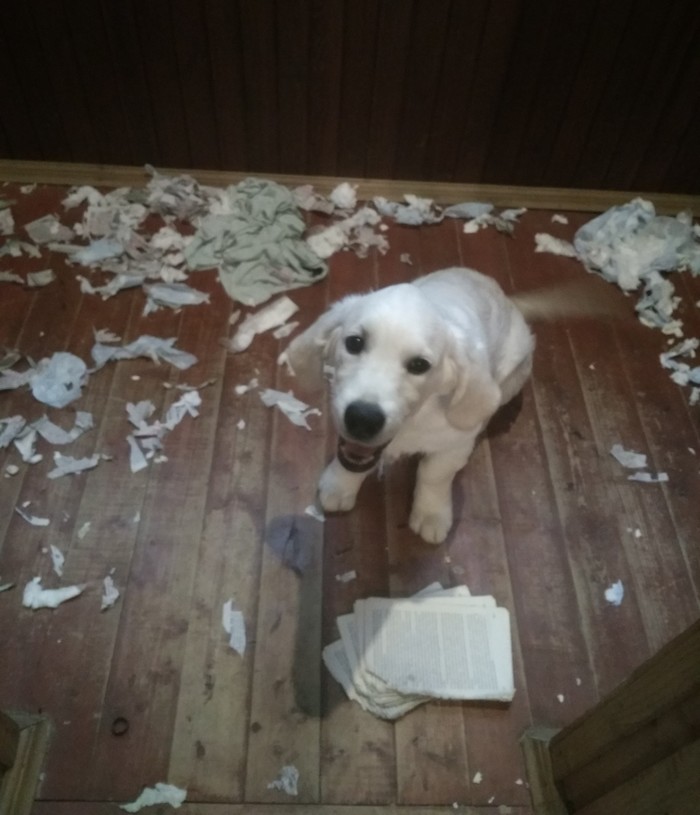 Ближе к ноябрю стало холодать и мы решили оставлять его в квартире. Мы читали много о содержании собак дома, у девушки ещё и опыт в содержании собак есть, поэтому были готовы ко всему. Но на удивление отделались очень малыми разрушениями даже для голдена. Мебель и полы остались целы, а если посчитать, то за все время было съедено: мышка от ноута, 1 книга, 1 настолка, набор для изготовления магнитов из гипса, стельки ботинок (он как-то пытался пожевать ботинок, за что и получил, а про стельки уговора не было), погрыз шумовку и точилку для ножей (почему-то очень любит пластик грызть), разбил кофетницу, но даже не поранился, хотя мы чуть не поседели думая, что дурень стекла наелся, но он наелся только конфет). Я прекрасно понимаю, что не собака плохая нашла/сломала что-то, а мы плохо спрятали. Сейчас уже спокойно его оставляем дома на долго, большая часть вещей убрана, у пса много игрушек, ну если что-то сгрыз, значит ненежное было)