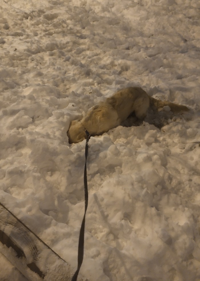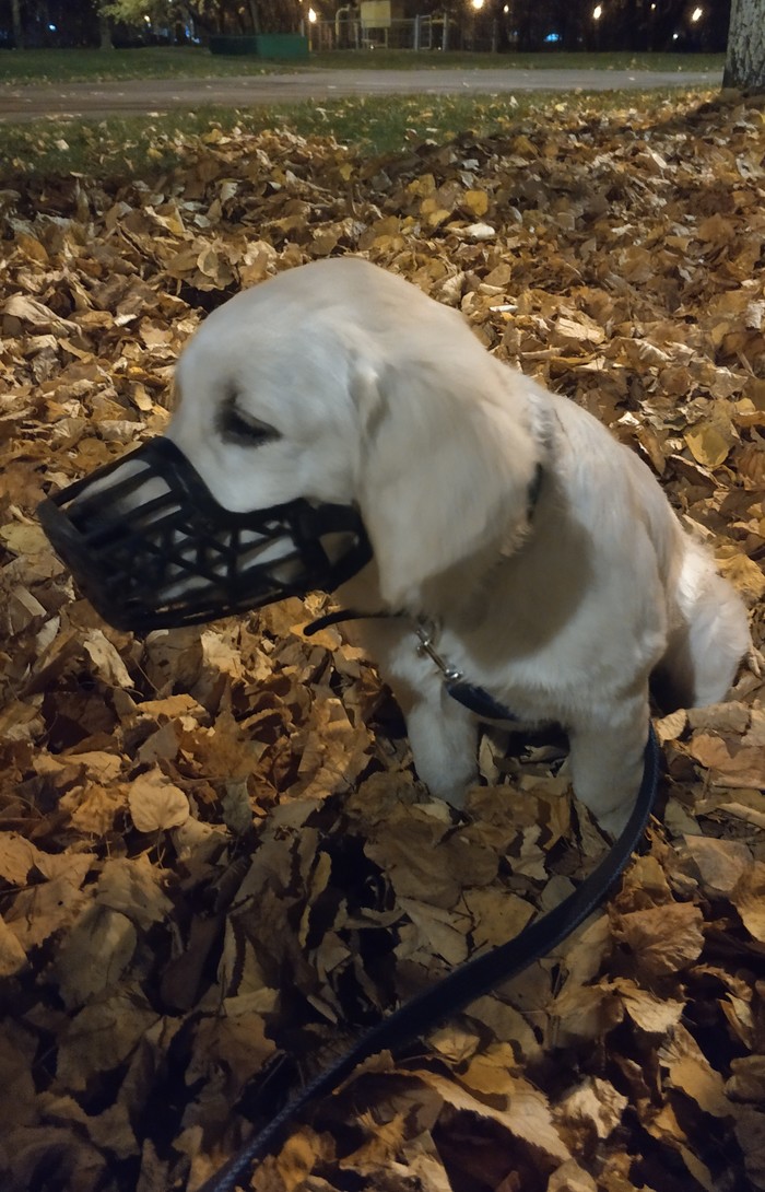 К середине октября карантин после привики от бешенства прошел и мы начали гулять. К ошейнику мы его приучали сразу, а за несколько дней до окончания карантина начали приучать к поводку. Люк довольно быстро привык к улице и быстро приучился ходить на улице и терпеть (мы уже почти месяц как пеленки совсем не используем). Первые дни мы ходили без намордника и прокляли все на свете, потому что каждые 5 минут мы что-нибудь доставали из пасти, особенно яблоки, которые валялись повсюду осенью, поэтому мы все-таки взяли намордник. Люк побунтовал пару дней, но похоже пришел к выводу, что с нами не прокатит. Сейчас мы наоборот потихоньку учимся ходить без намордника. Люк хотя бы стал реагировать на "фу" да и мусора зимой поменьше. Гуляет пес у нас 2-3 раза в день, суммарно по 2-2,5 часа в будни и 3-4 часа в выходные, поэтому в выхи он обычно только дрыхнет дома)) После прогулок спокойно идет в ванную, только прикидывается валенком, тип "я зашел, а дальше сам", но зато без истерик.