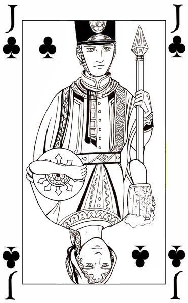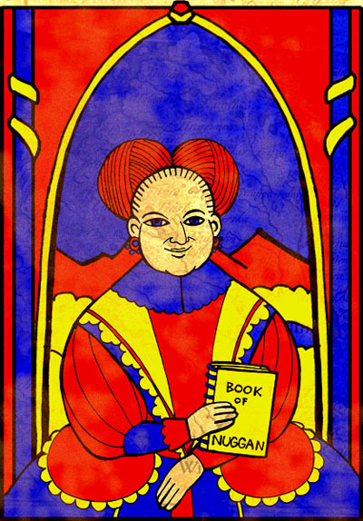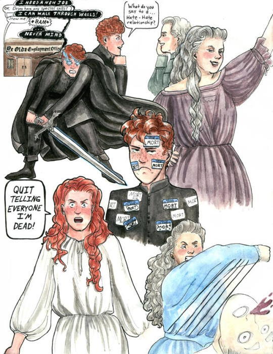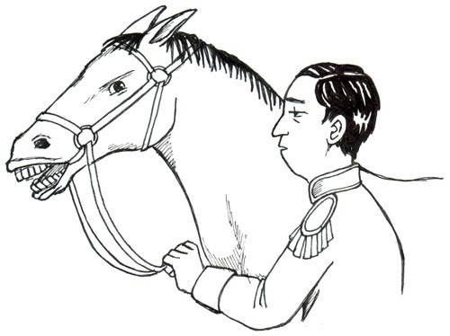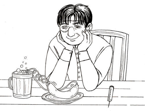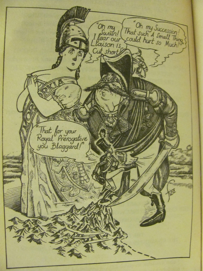 ««Наш художник Физз нарисовал это для специального выпуска… […] Полли увидела черно-белый тщательно затушеванный рисунок. На нем была изображена гигантская фигура с огромным мечом, чудовищным моноклем и усами, похожими на вешалку. Великан грозил маленькому человечку, вооруженному сельскохозяйственным орудием, которым копают свеклу (и на острие действительно была надета свекла). По крайней мере, таково было положение действующих лиц до той минуты, пока маленький человечек, почти в точной копии кивера «Тудой-сюдой» и слегка похожий лицом на Полли, не пнул великана прямо в пах. Изо рта Полли вылетало нечто вроде воздушного шарика, на котором было написано: «Вот тебе королевские привилегии, мерзавец!» Изо рта великана – разумеется, князя Генриха – тоже вылетал шарик со словами: «О, мои наследники! Такой мелкий, а как больно!» На заднем плане какая-то толстуха в мятом бальном платье и огромном старинном шлеме прижимала обе руки к гигантской груди и устремляла на противников взгляд, полный тревоги и восхищения. Надпись на шарике гласила: «О мой кавалер! Боюсь, наша связь расторгнута! […]