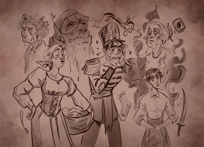 В английской вики утверждается, что план Блуза проникнуть в крепость под видом прачек отсылает нас к «Ветру в Ивах» Кеннета Грэма, где мистер Жабб бежал из тюрьмы, переодевшись прачкой и проявив в дальнейшем чудеса храбрости и находчивости. Однако нам кажется, что Грэм, точно как и ПТерри здесь, подтрунивает над этим клише приключенческого жанра.