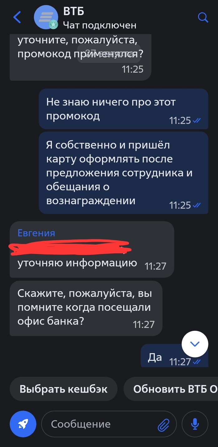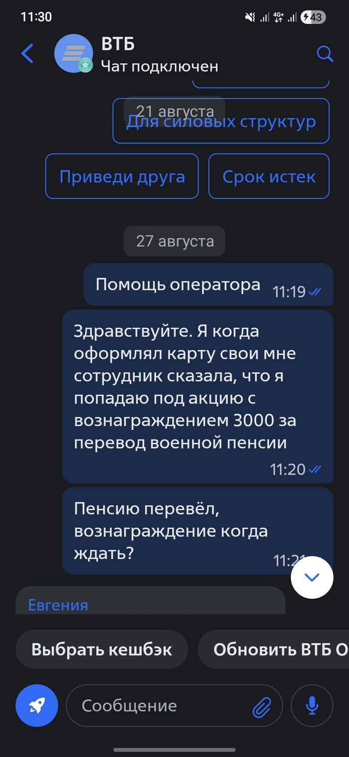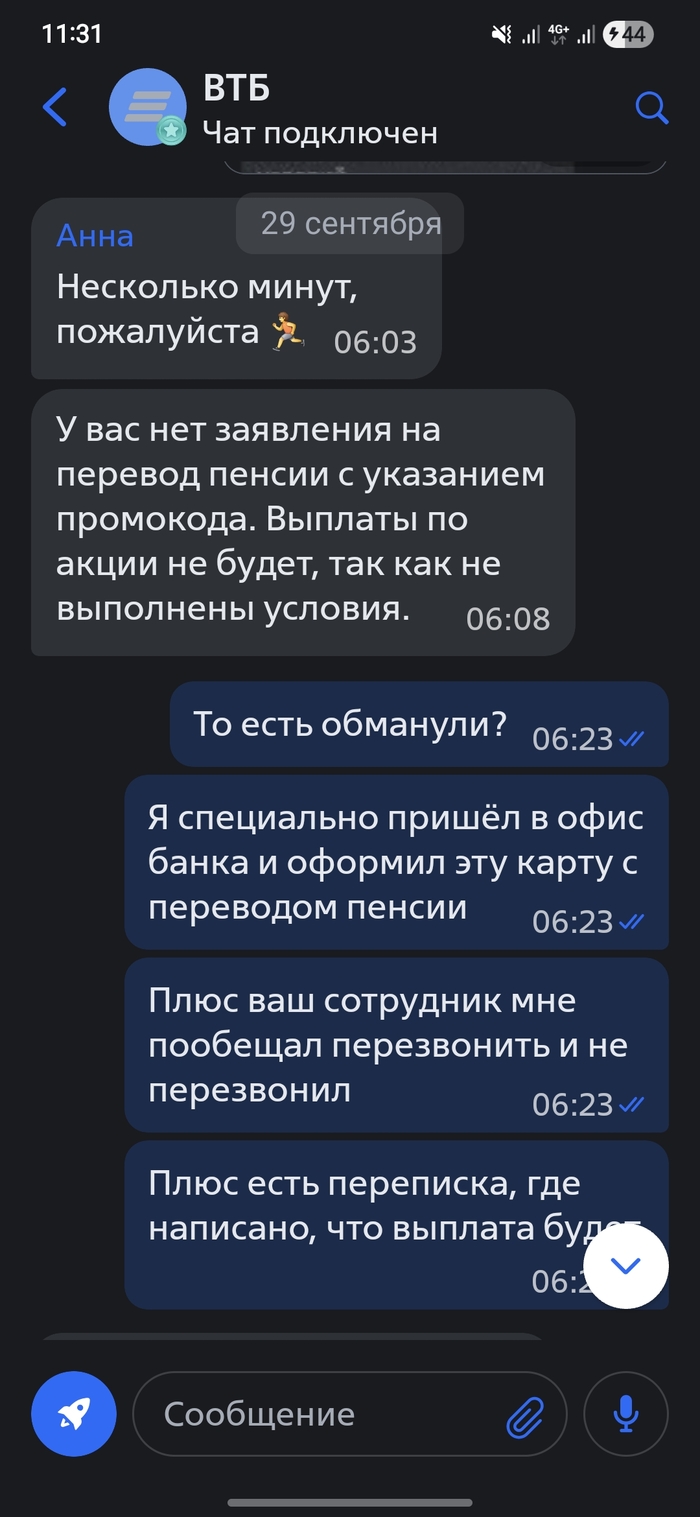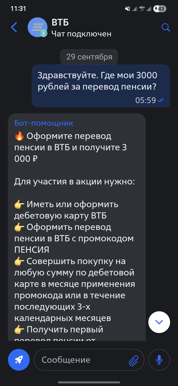 Увидел рекламу от ВТБ, что за перевод пенсии к ним дадут 3000 в подарок. Пришёл в банк, оформил карту СВОи, написал заявление на перевод пенсии, обсудил все с сотрудником и пошёл по своим делам. При общении с сотрудником неоднократно говорилось о положенных 3000₽. Собственно, ради этого и был поход в банк.