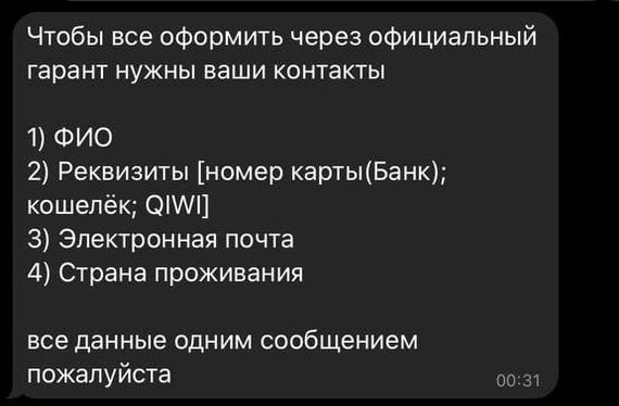 "Ок, насчёт оплаты. Наша компания работает через БС-Безопасная сделка https://www.сайтфрилансеров.ru/promo/bezopasnaya-sdelka/. Суть гаранта: я вношу ему залог 10% за нашу работу и отправляю Вашу зарплату (30 000р). Вам придёт письмо подтверждения на почту, вы так же вносите залог (3 000р) и отправляете скрин оплаты ответным письмом гаранту.