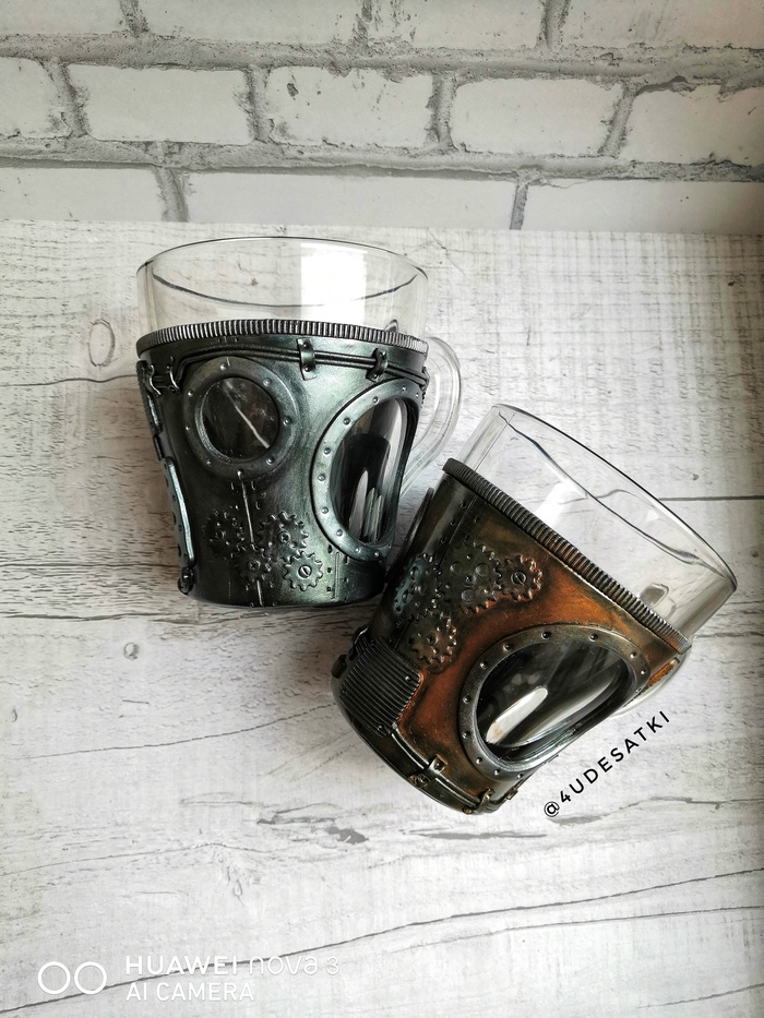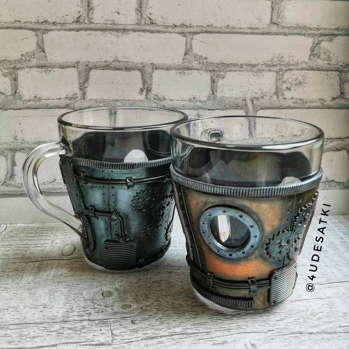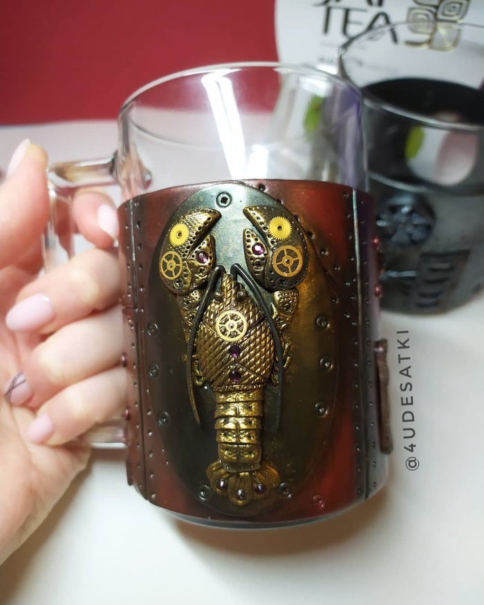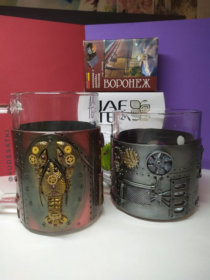 Использовала для декора стеклянную кружку, полимерную глину, краски и лак, чтоб водой не смыло)