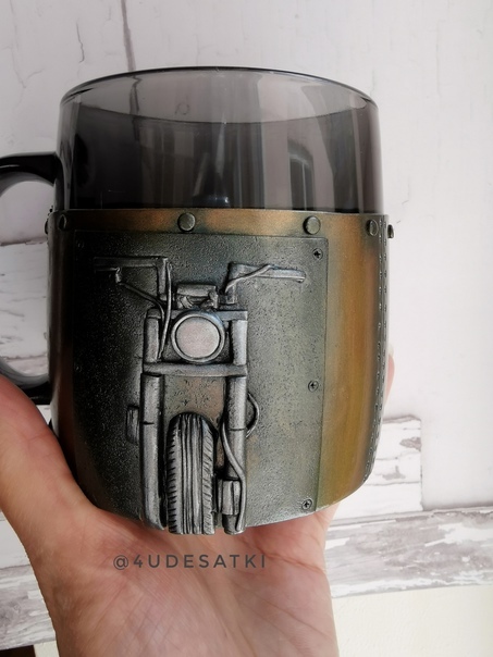 Я как-то не нашла подходящего места для стимпанка, решила просто сделать её "железяной". С одной стороны логотип, с другой мото с ретро-плаката стыреный.
