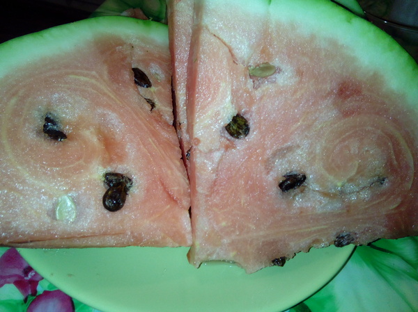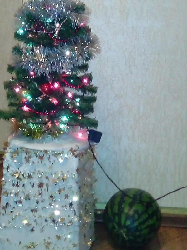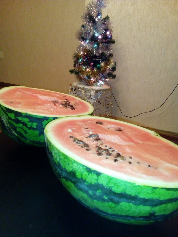 И вот новогодняя ночь, торжественный момент, выживший арбузик извлечён, вымыт, положен под йолку.