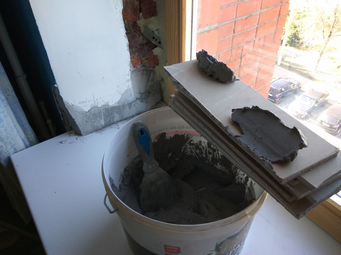 Закидывать амбразуры раствором - долго и муторно. Нарезал-наломал огрызки гипсокартона по ширине амбразуры, замутил густой Rotband -