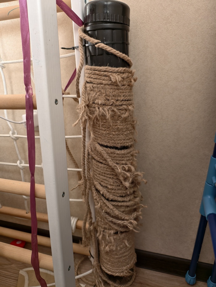 Как пользоваться когтеточкой тоже показывать не пришлось. Кот увидел, что кошка шкребет веревку и быстро понял что к чему. Диван/обои целые и невредимые.