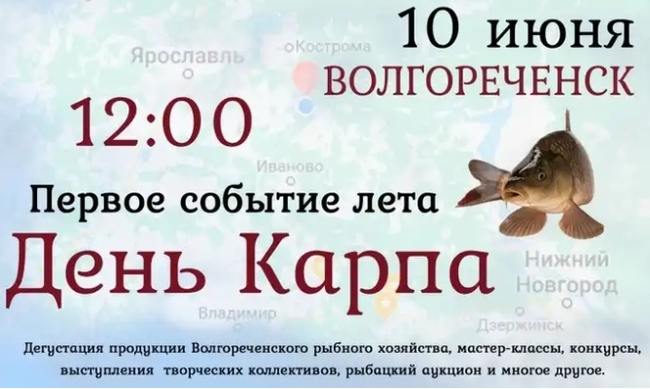 В Костромской области впервые проводится День Карпа. Праздник стартует сегодня в полдень в Волгореченске и пройдет до самого вечера. Город энергетиков ждет много гостей. На площадке Свято-Тихоновского собора у «Лукоморья» развернутся развлекательная программа, рыбацкий аукцион и освящение удочек, мастер-класс по приготовлению карпа под открытым небом, выставка-ярмарка.