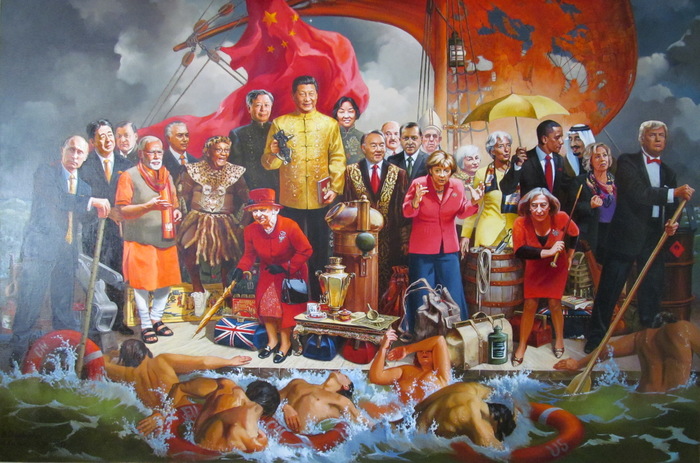 Королева Великобритании спихивает с плота голого человека, пытающуюся забраться. То же самое делает представительница Англии Тереза Мэй, она буквально хочет утопить человека, а точнее страну за бортом, замахиваясь на него палкой и не давая подняться.