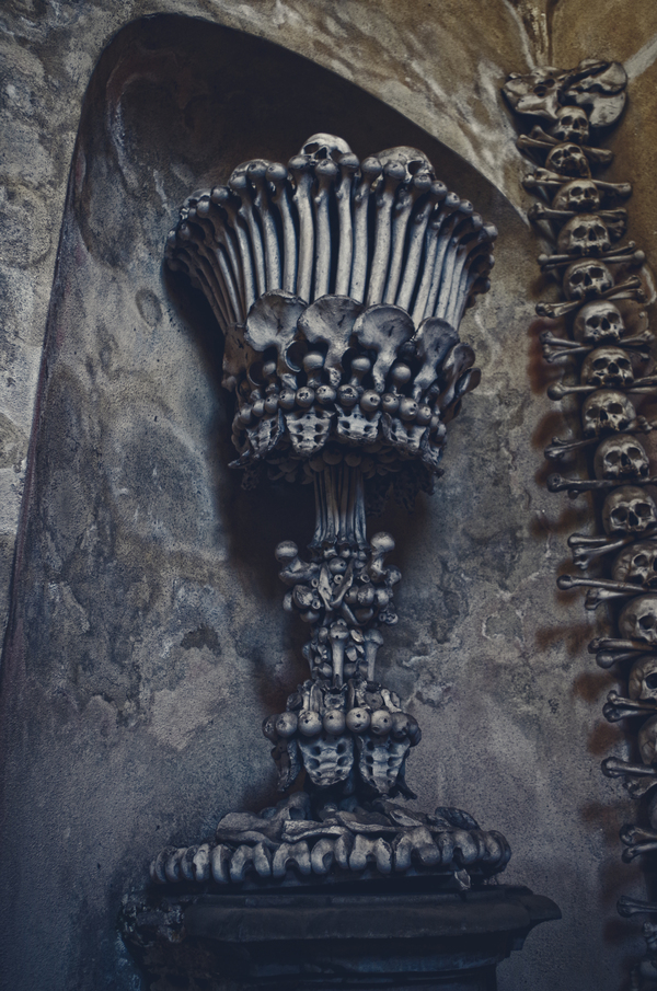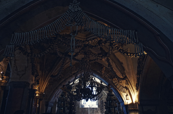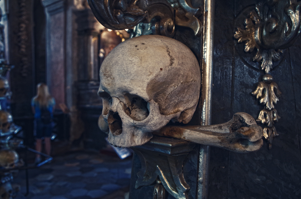 Кутна Гора. В 1142 году, когда сам город еще не существовал, богатый дворянин Мирослав Марквартиц основал здесь монастырь ордена Цистерцианцев. Позднее, во второй половине 13-го века, когда монастырем управляет аббат Генденрейх, начинается процветание края. В это время на территории монастыря был построен первый в Чехии собор кафедрального типа посвященный Успению девы Марии. Чешский король Пржемысл Отокар Второй послал другого аббата этого монастыря Индржиха второго с посольством в Палестину. Аббат вернулся в 1278 году и привез с собой землю холма Голгофа. Эту землю он рассыпал на месте, где сейчас расположено кладбище (прилегающие к часовне территории), и с тех пор стали считать, что место это и земля - святые. По легенде, тело, захороненное на этом кладбище начинает разлагаться на 3-й день, поэтому многие люди (не только из числа Чехов) завещали быть похороненными именно на этом кладбище. В 1318 году в Чехии вспыхнула эпидемия чумы. В этот год на кладбище похоронили около 30 тыс. человек, а само кладбище занимало три с половиной гектара. В конце 14-го века началось строительство часовни и ее подвальной части. Часовня была освещена в 1400 году. Захоронения на кладбище продолжались. Наиболее массовые относятся к 1421 и 1424 годам. 25 апреля 1421 года Ян Жижка захватил монастырь, и гуситы казнили около 500 монахов Останки которых были захоронены на кладбище. При упразднении и реконструкции кладбища кости выгребали из земли и переносили в подвальную часть часовни, где со временем получился огромный склеп. Согласно легенде, после 1511 года работу по извлечению скелетов из могил и складированию их в усыпальнице выполнял полуслепой монах цистерцианского ордена, он так же создает и первые 6 пирамид из костей. В 1784 году император распорядился закрыть монастырь. Часовню и монастырские земли купила семья Шварценбергов. В 1870 году Шварценберги наняли резчика по дереву Франтишека Ринта для того, чтобы он привёл в порядок груду сложенных костей. Ринт вместе с 4-я членами своей семьи и создал интерьер костехранилища, который сохранился почти без изменений.