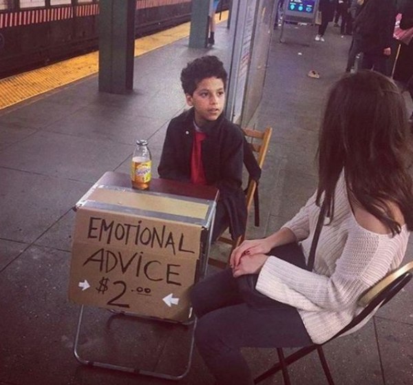 11-летний пацан из Бруклина даёт в метро "эмоциональные советы". $2 за совет. Люди говорят, что советы дельные и реально помогают в жизни.