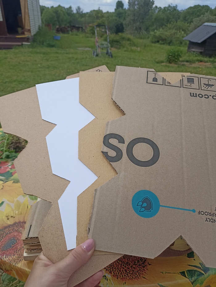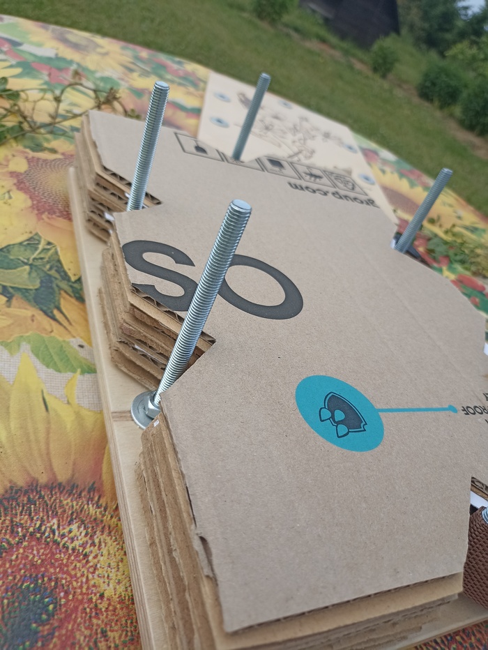Внутри у нас получился вот такой "пирожок" из ДВП (для жёсткости и ровности), гофрированного картона (амортизация), толстого картона и акварельной бумаги.