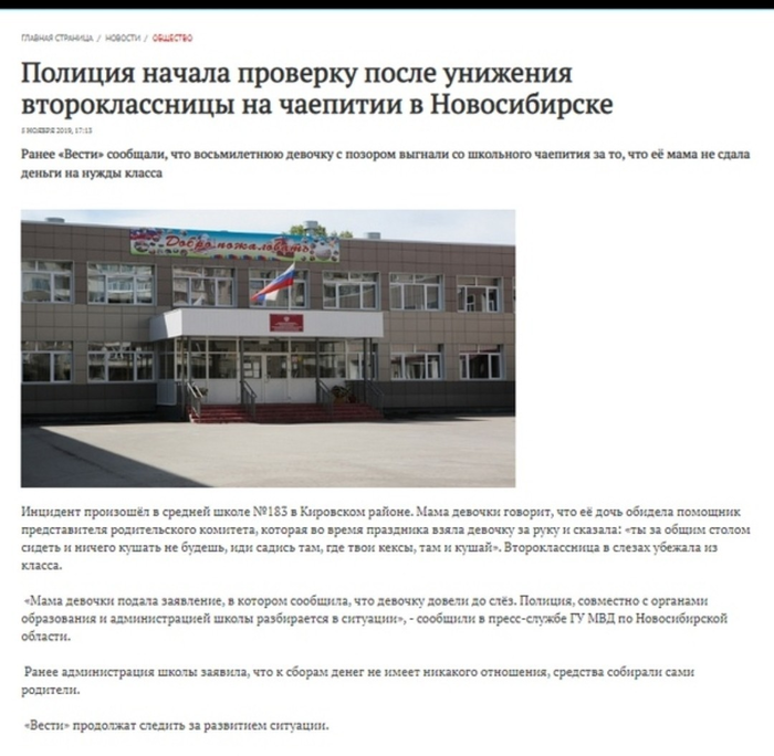 Инцидент с чаепитием произошел в начале ноября — новосибирскую школьницу выгнали с мероприятия за то, что ее мама отказалась сдавать деньги на нужды класса из-за отсутствия отчетности. Мать девочки рассказала, что ребенка довели до слез, запретив ей сидеть и есть со всеми.