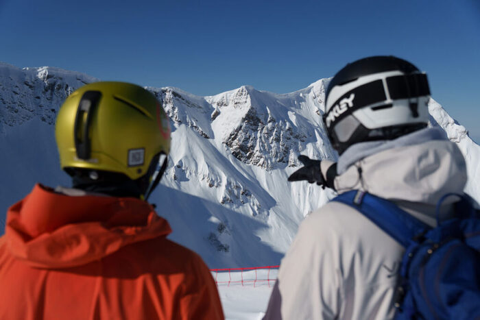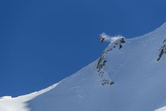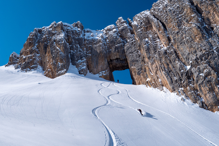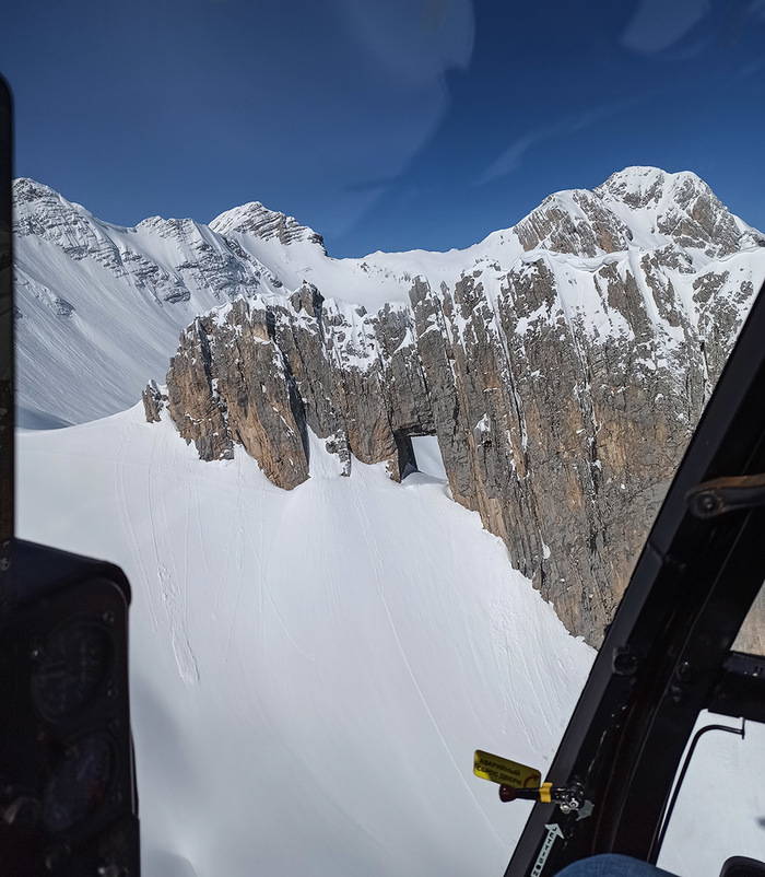 Впереди долгожданные спуски, адреналин начинает зашкаливать. Гид подобрал под нашу группу первый разминочный маршрут, протяженностью более 1000 м, но с легким рельефом, дал указания и показал линию спуска и точку остановки. Дальше все как в мечте фрирайдера! Легкий снежный пух искрился и буквально взрывался под сноубордом. Это был серфинг по снегу, ощущение парящего движения. Внизу нас подхватил тот самый волшебный синий вертолет и мы полетели на следующую вершину. Мы высадились, проехали 200 метров в траверс до удивительного места в отдельно возвышающейся скале под названием Глаз Дракона, арка – с правильной геометрией, созданная природой и временем!