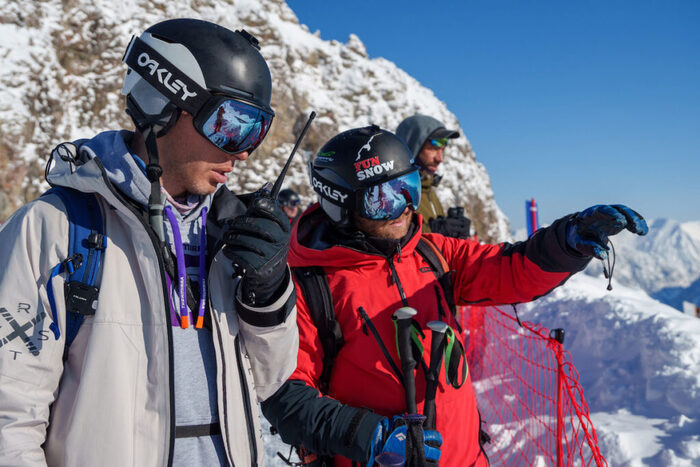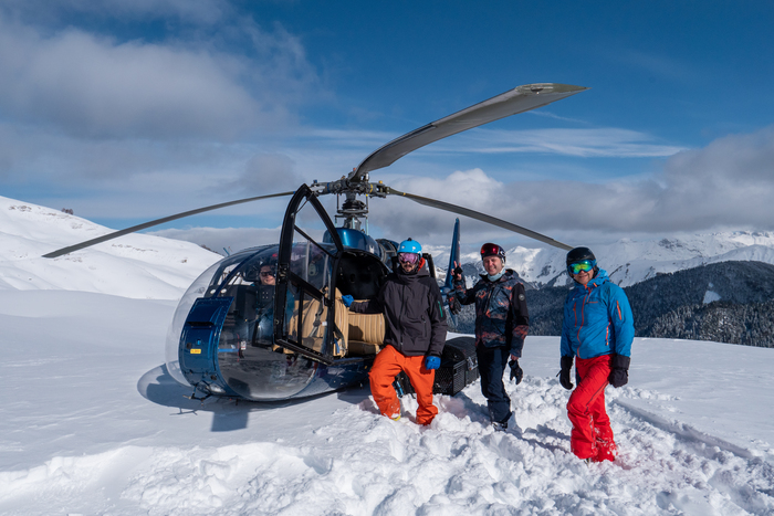 Всё запомнили, потренировались, сели... пилот запускает двигатель вертолета и лопасти начинают свое движение, скорость их вращения увеличивается, мы отрываемся от земли и летим… а через 10 минут уже вертолет садится на гребне горы Чолгон, на высоте 2650 м. Гид открывает дверь и мы поочередно осторожно высаживаемся, но не прыгая как в фильмах или ролике Соболева о прыжке с вертолета, а буквально сползаем вниз на снег и ждем следующие указания гида! Скорость происходящего создало ощущение телепортации - будто синий вертолет Gazelle доставил нас в другой мир, в Республику Фрирайда в котором мы были отрезаны от реальности в окружении снежных горных массивов. Пилот заглушил двигатель. Вокруг тишина, спокойствие, горные массивы, скалы, кулуары, карнизы с одной стороны, с другой – бескрайнее море с переливающимся отражением утреннего солнца…