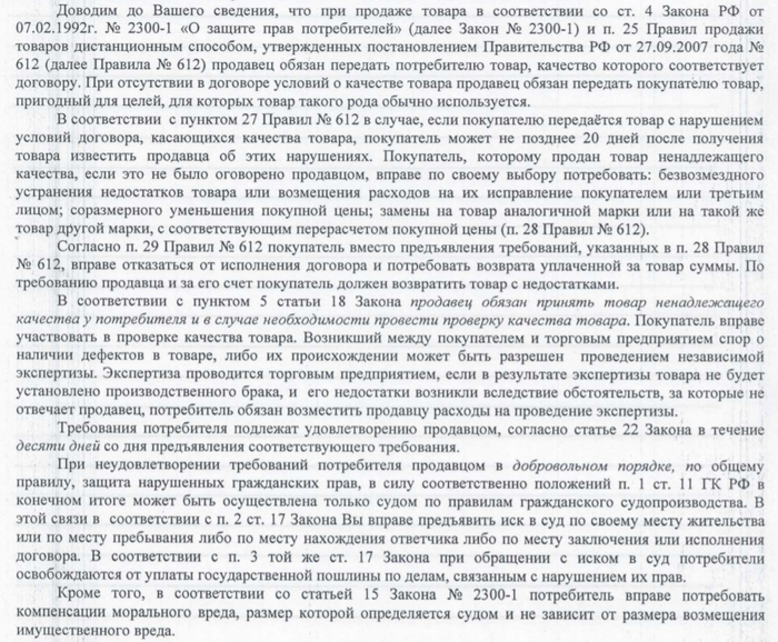 На сегодняшний день ответ на претензию пока не поступил, со мной больше никто не связывался.