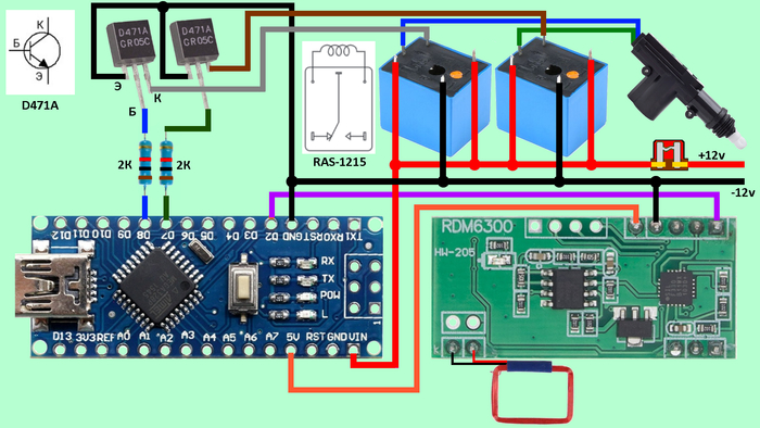 После установки "Аквазамка" в автомобиль надевается РФИД браслет на руку и автомобиль закрывается, для этого нужно приложить к лобовому стеклу запястье с браслетом в определенное место где наклеена антенна. Далее идут водные процедуры и открытие центрального замка так же приложением запястья. Замок показал себя с лучшей стороны на горнолыжном курорте где вся одежда промокала насквозь, в походах в баню и купание в проруби. Вот схема замка на ардуино нано и модуле RDM 6300