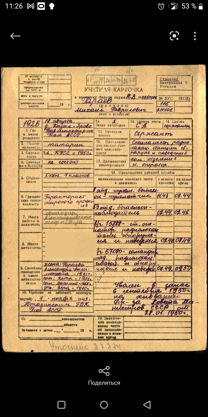 Только недавно, подняв документы, узнал что он из под Бугульмы родом, с.Кызыл-Ярово, и есть у меня там еще родня.