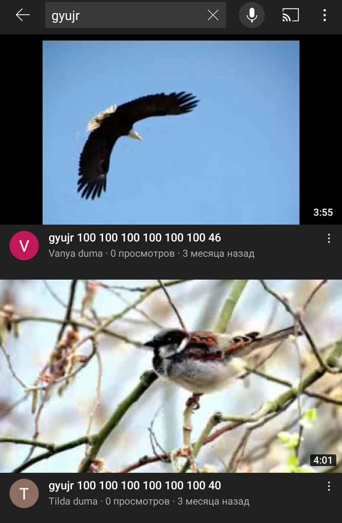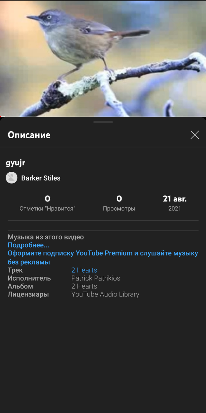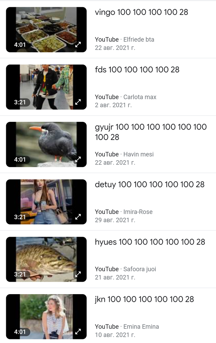 Например, видео под названием "gyujr", загружённые с 21 по 22 августа, на самую самую малость менее рандомные, там под музыку из аудиотеки YouTube двигаются лишь фотографии птиц. Канал, загрузивший первое видео с таким названием, тоже создан в декабре 2020 года.