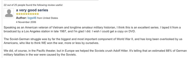 Я, как американский ветеран Вьетнамской Войны и старый военный историк-любитель, и думаю, что это отличный сериал. Я записал ее с Лос-Анджелеской вещательной станции в конце 1987 года, и я рад, что сделал. Я хотел бы получить копию на DVD.