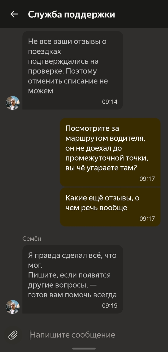 В итоге Яндекс говорит что ничем помочь не может) у них же 100% есть маршрут водителя, по которому он двигался, где видно что водитель исполнял какую-то ерунду)) Я просто в шоке от того на сколько им по**й на клиентов) в неделю могу до 10к на такси потратить, так, на заметку.
