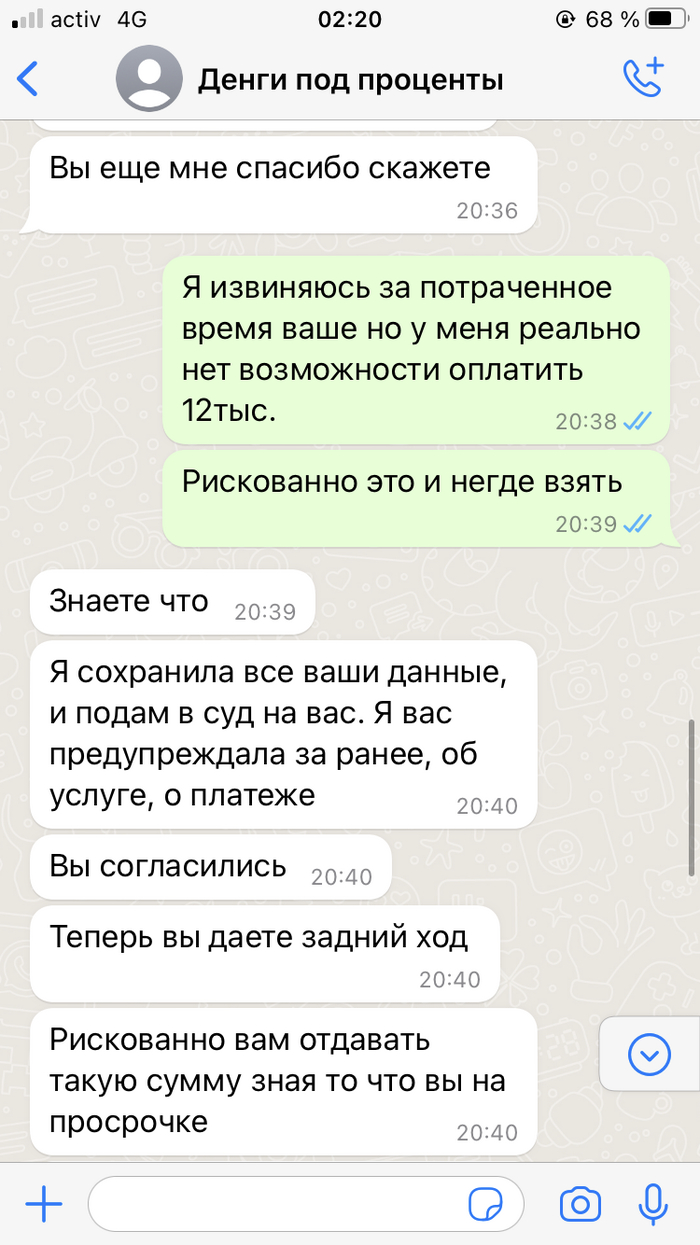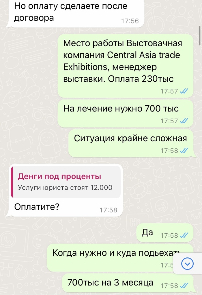 так как карта в блоке и близких в городе нету, решил была не была, буду искать Денги под процент. Подал во все микро кредитные везде отказ, у всех знакомых нету , написал я значит человеку из объявления olx. Ответили быстро и что сразу насторожило меня, что есть услуги юриста и они их не оплачивают, ладно думаю это везде так. Но дальше в разговоре убедился что, это чистый развод и все идёт к тому, что человек то ли от жадности то ли от безысходности готов поверить во все и сумма в 12тыс тенге (1,3руб) не такая большая и ты можешь перевести ее в надежде на получение кредита. Я конечно в такой ситуации впервые но жертвовать последние Денги не рискнул и решил дальше пробить, как итог она сказала, что я ее морочил целый день и она подаст на меня в суд)))