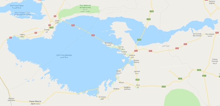 Cолёное озеро в центральной части Туниса и солончаковая впадина, расположенная в серии понижений, тянущейся вглубь Сахары от залива Габес.