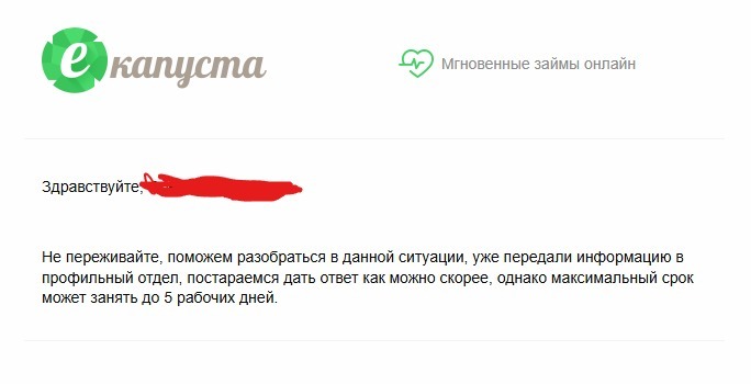 Я даже сначала не поверил. Звоню на горячую линию сбербанка.. Объясняю что я не зарегистрирован на этом сайте и никогда им не пользовался, что у меня в истории нет операции связанных с еКапустой, на мне даже кредитов нет и никогда не было. Сделайте возврат средств!(для меня это было логично т.к еКапуста это не мошенники, которые увели бабки и их хрен потом отследишь, а какой-то сервис микрозаймов.)