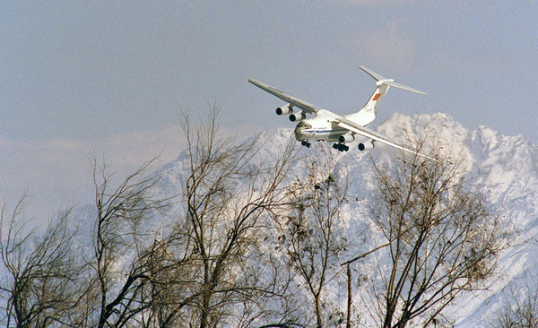 Советский транспортный самолет заходит на посадку в аэропорту Кабула 8 февраля, 1989 года.