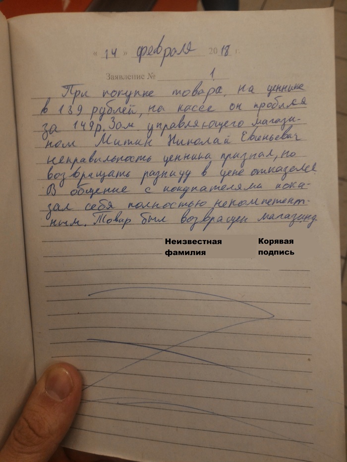 Неверность цены признает, на вопрос о возврате активно косит под дурачка (да что ты из-за 10 рублей-то, товар на ценнике немного другой, ну не успели напечатать), о правах потребителя явно не слышал. Жалубную книгу принес, по моей просьбе. Открываю. Ого, я первый в книге.