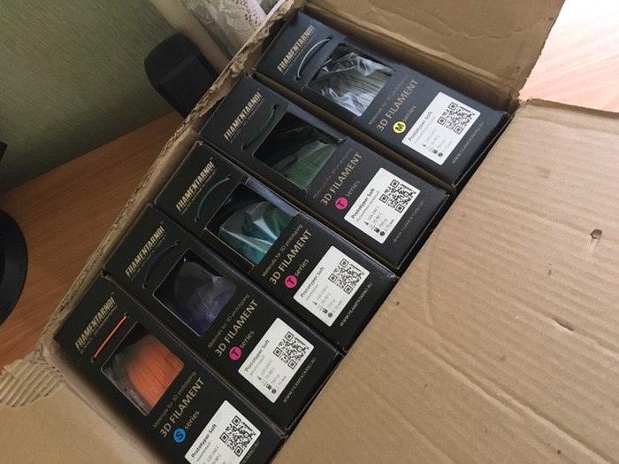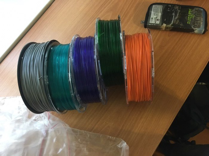 Пластика PLA в нашем городе не нашлось(за приемлемую цену), поэтому пока печатаем на том что есть: PLA и рыболовная леска (ну и еще есть немного подаренных пробников)