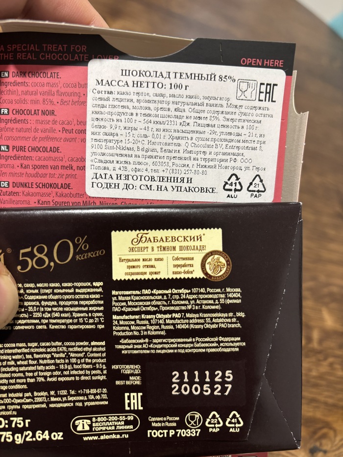 Цена в пересчете на грамм у вражеского выше на 25%, вот только один горький 85%, а другой, при покупке через доставку стыдливо скрывает % и в названии и на фото, надеялся на 75, оказалось 58(