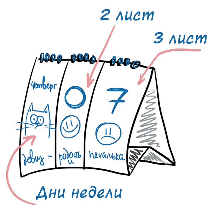 Он состоит из трех групп листиков, на первом - дни недели , на втором и третьем - цифры, и фразочки-девизы дня )