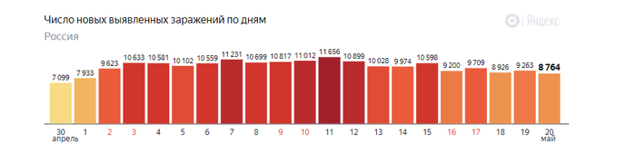 Т.е. да, до 18 мая действительно шел спад, но уже сегодня кол-во новых заболевших БОЛЬШЕ, чем 11 мая, когда число заболевших по статистике Яндекса было наибольшее. 11 мая было 17151 реально заболевших.