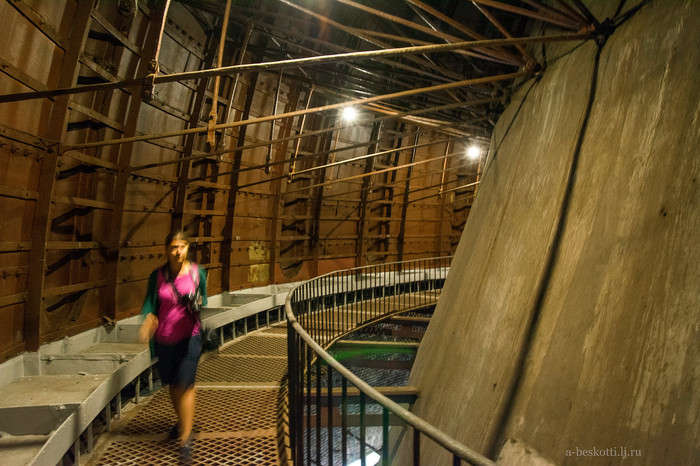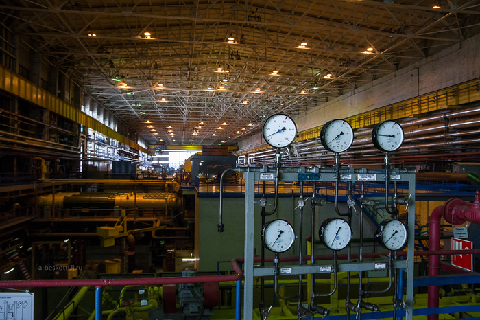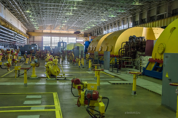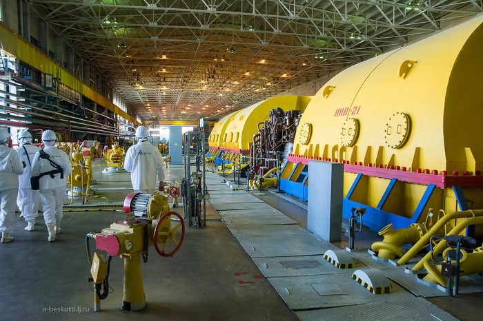 Прежде, чем добраться до турбинного зала, надо пройти мимо баков цеха химической подготовки воды. Воду мало просто очистить, её ещё и особым образом придётся подготовить. Любая примесь может негативно повлиять на работу. А в воду первого контура надо ещё и бор добавить, он служит регулятором активности. И расход такой вот особой воды весьма немаленький.